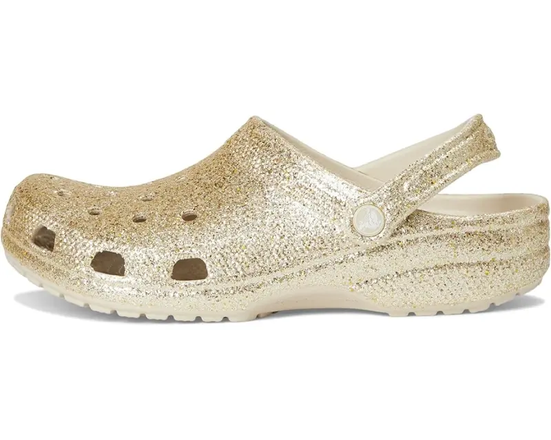 • Let the fun begin in the Crocs® Classic Clog – Glitter. Croslite™ uppers are available in a variety of colors in patterns in a slip-on design with an adjustable heel strap and ventilation ports for breathability.